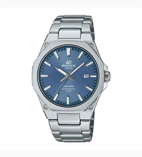 EDIFICE SLIM series with Sapphire Crystal | This three-hand analog model features a slim 7.8 mm thick case that enhances fit. The watch boasts a flat octagonal bezel with a hairline finish that creates a sporty yet luxurious design. A dial with a hairline finish also creates a high quality feel. Uses a scratch-resistant sapphire crystal.